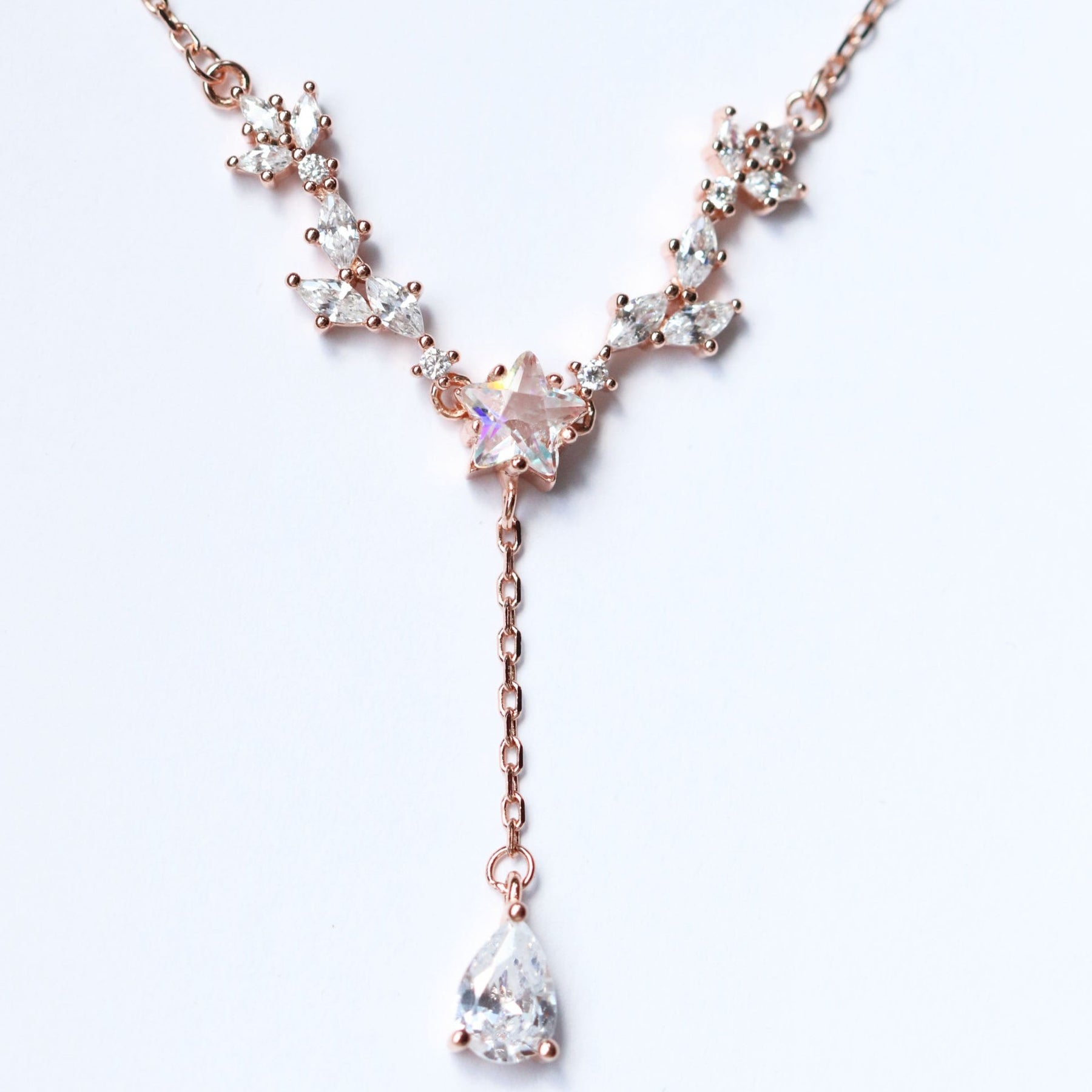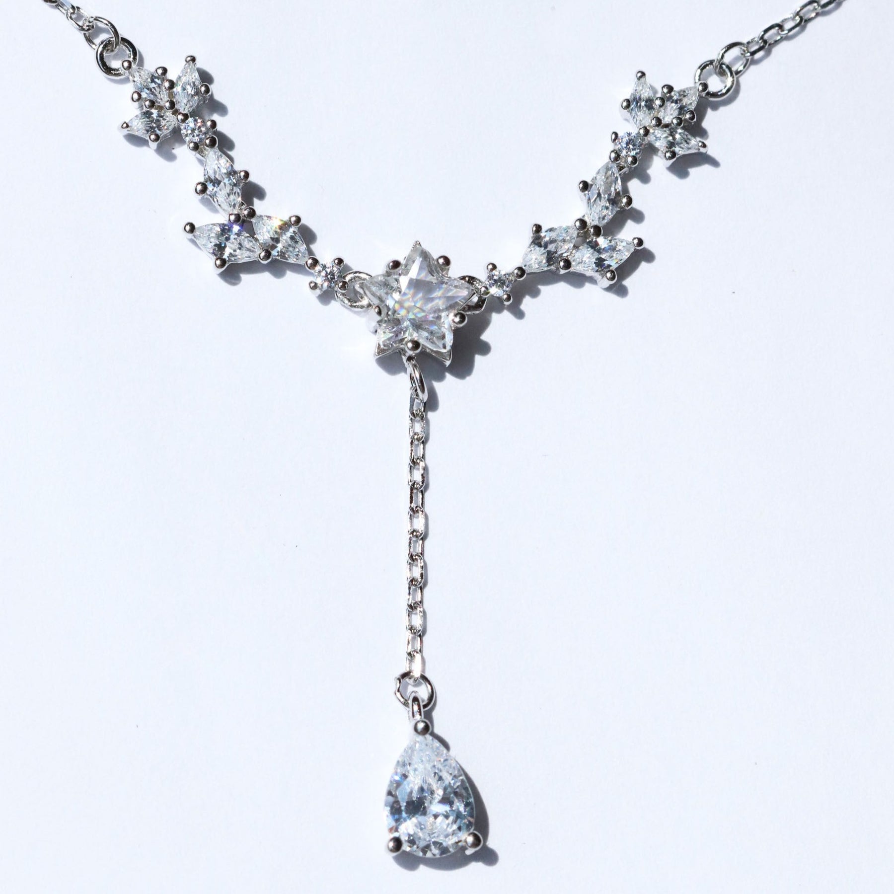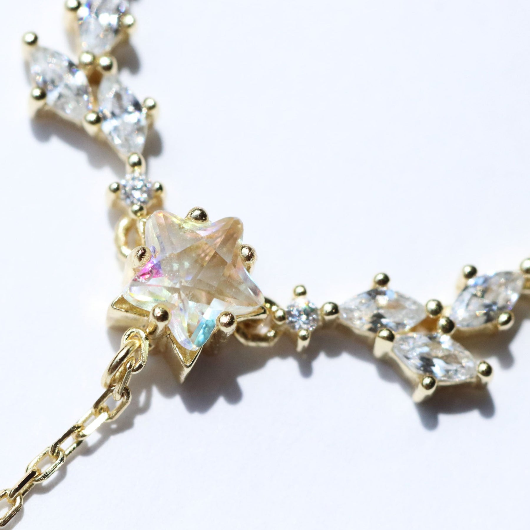 A lone star shines brightly tonight, its radiance illuminating the land and sea. A shining, white star is the centerpiece of the Phoebe Necklace, surrounded by a crystal laurel wreath and dripping pure starlight down a dangling chain. Crafted from sterling silver .925, this piece will add starpower to any magical look and is available plated in yellow gold, rose gold, or rhodium. All stones used in this piece are synthetic, and the chain measures 14 inches with a 2-inch extender.