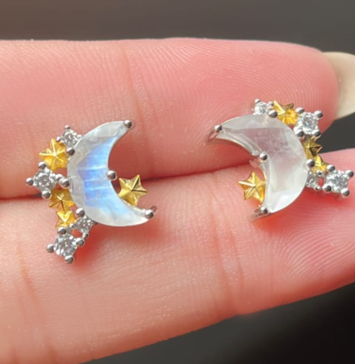 Shine as brilliantly as the moon and stars in the night sky with the Moonlet Stud Earrings! Each crescent moon is cut from gleaming moonstone, complemented by shimmering cubic zirconia stones that are sure to bring your cosmic look to the next level. Made of sterling silver .925, this piece is also plated in 14Kt yellow gold and rhodium for extra shine.