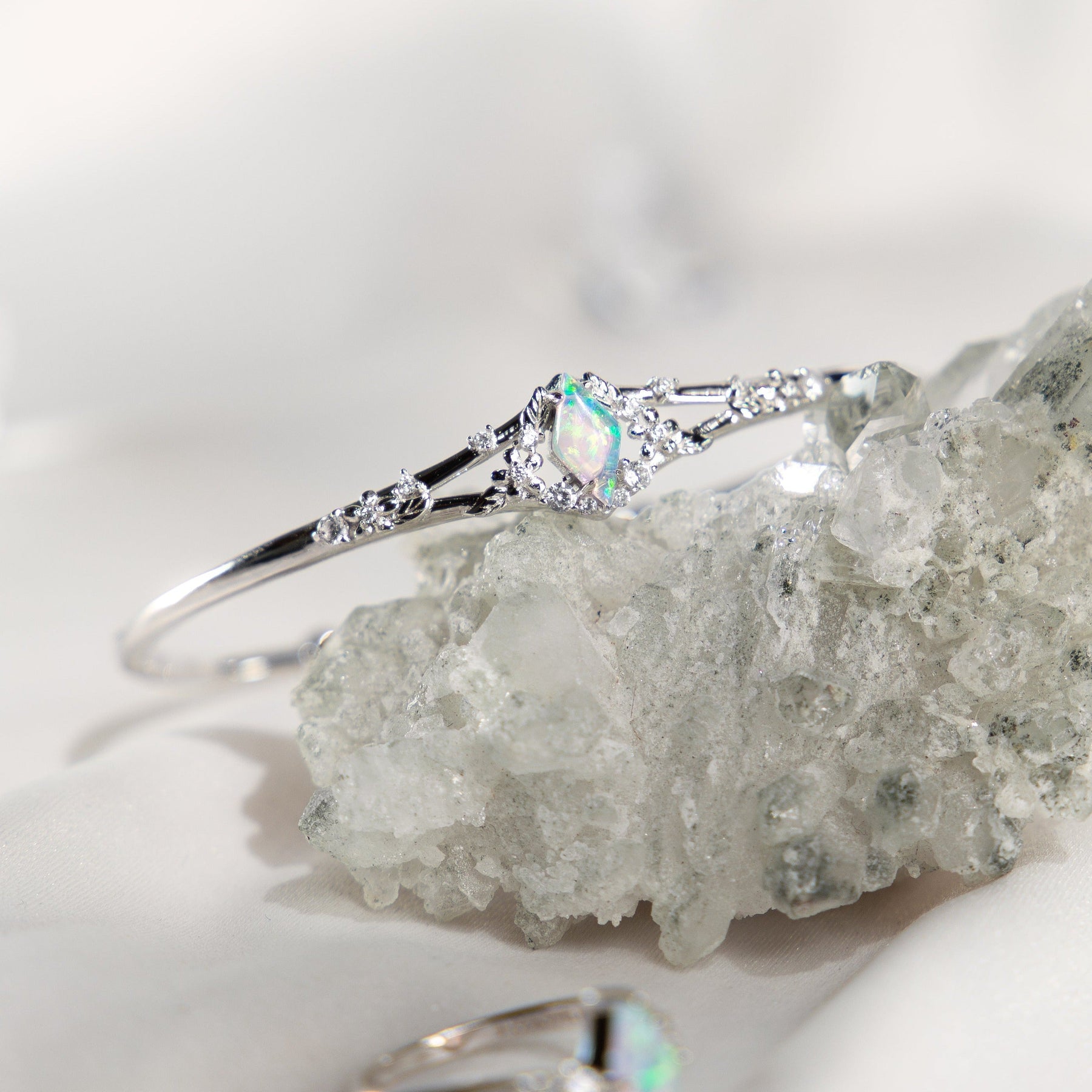 This Bangle exudes an elegance that will have you feeling like royalty. Measuring approximately 2 and ¼ inches in diameter, the bangle is also adjustable for your comfort. Made in Sterling silver .925 and plated in rhodium, with synthetic stones.