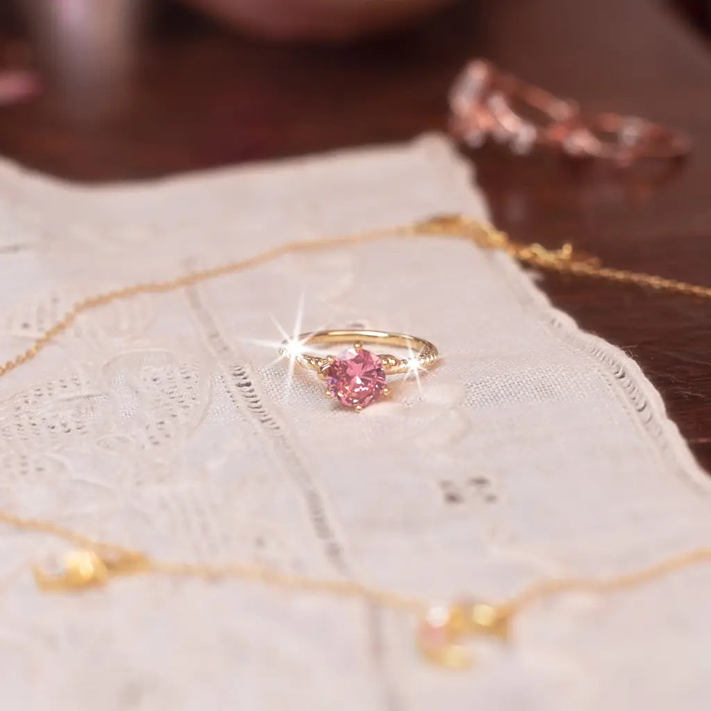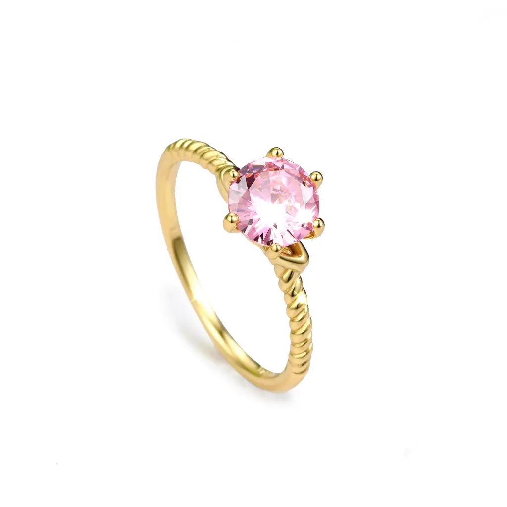 Our Saturn Ring is sterling silver .925 and plated in either yellow gold or rhodium. This ring features a planet with a light pink cubic zirconia stone along with metal details along the band. This is plated jewelry and with proper care, it may need to be replated after 1-2 years.