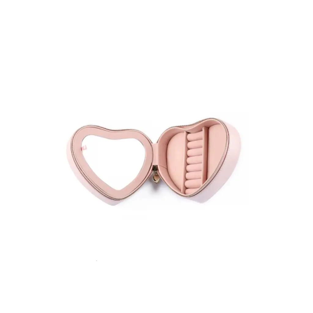 Make your day feel a little lovelier by bringing Bisou with you! The Bisou Travelling Case is the perfect travelling storage solution for your precious jewelry, offering storage compartments separated by a heart-shaped mirror. This case can hold necklaces, rings, and studs! With this travelling case, you’ll never miss an opportunity to show off all your pretty jewelry again! The Travel case measure 5 inches in Length and 6 Inches in Width.