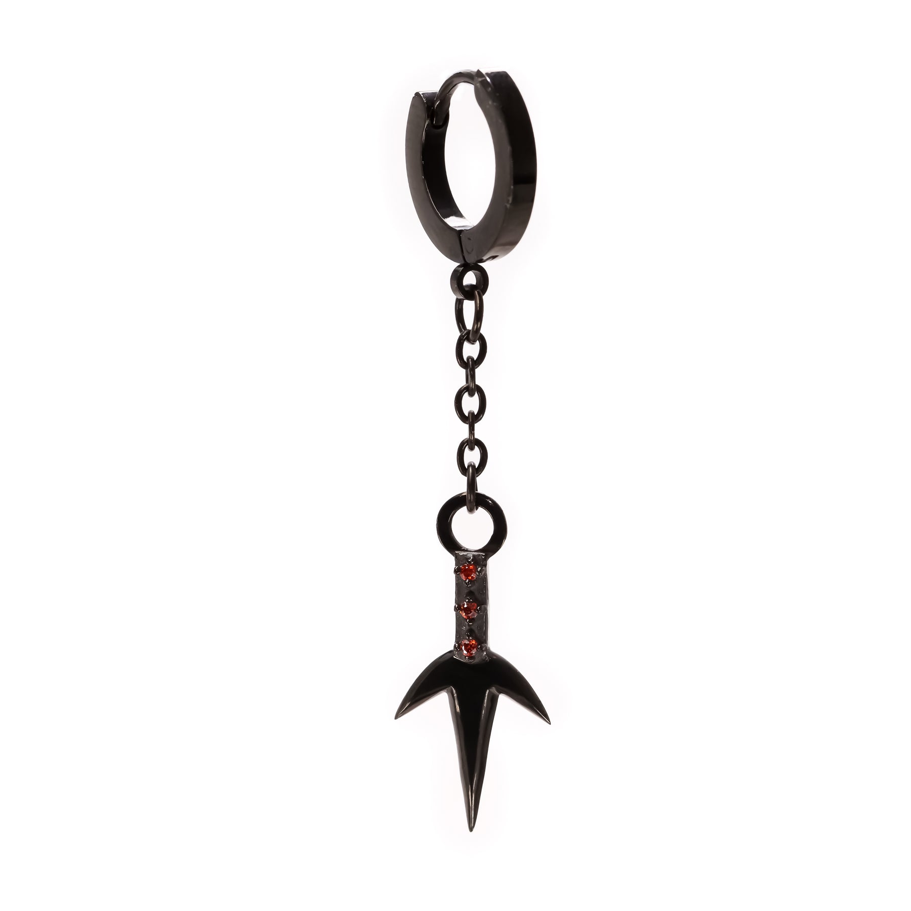 Add a new weapon to your shinobi arsenal with the single Kunai Shinobi Earrings. Featuring three sparkling red synthetic stones, the kunai dangles precariously by a single chain, waiting to be equipped. This single earring measures approximately 5cm in length and is crafted from stainless steel. The inner hoop diameter measures 0.9 cm, Kunai measures 2.3 cm.