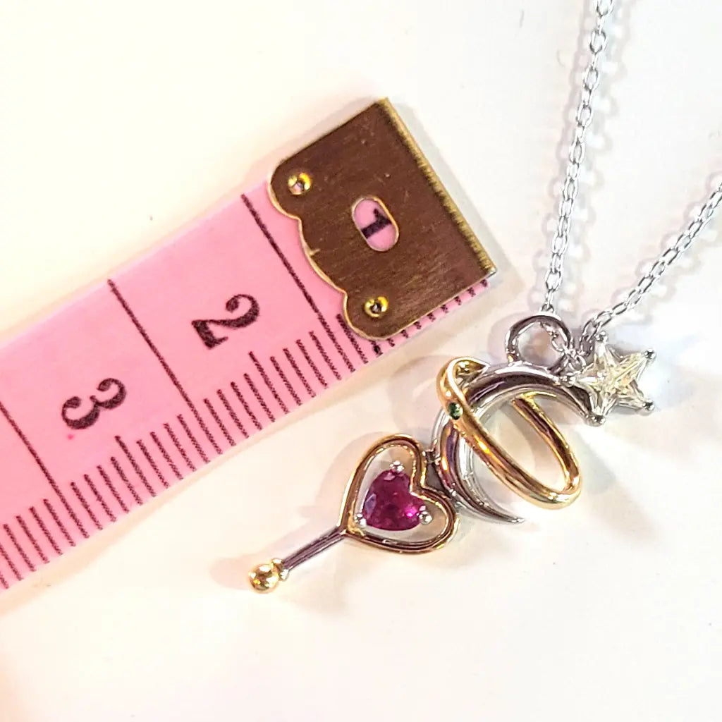 This moon pendant is sterling silver .925 plated in rhodium with yellow gold details. This pendant features multicolored cubic zirconia stones and a complementary chain. The chain measures 16" + 2 inch extender.