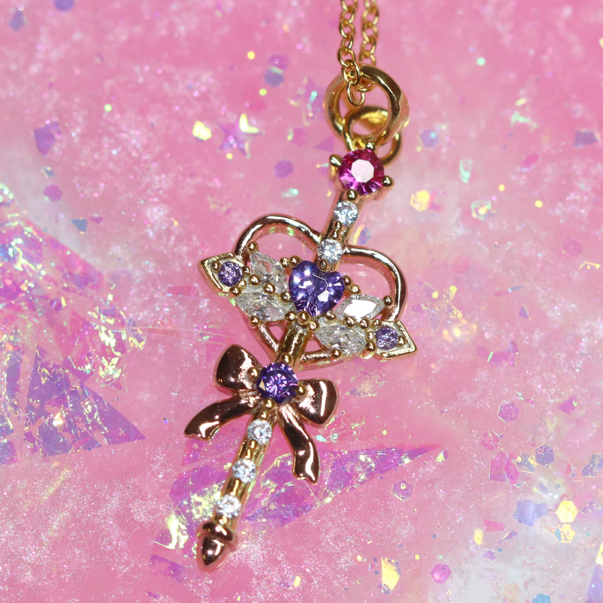 This wand pendant is made of sterling silver .925 and is plated in gold and rose gold. The stones are cz. It comes hanging on a complimentary chain that measures 18+2 inches extender.