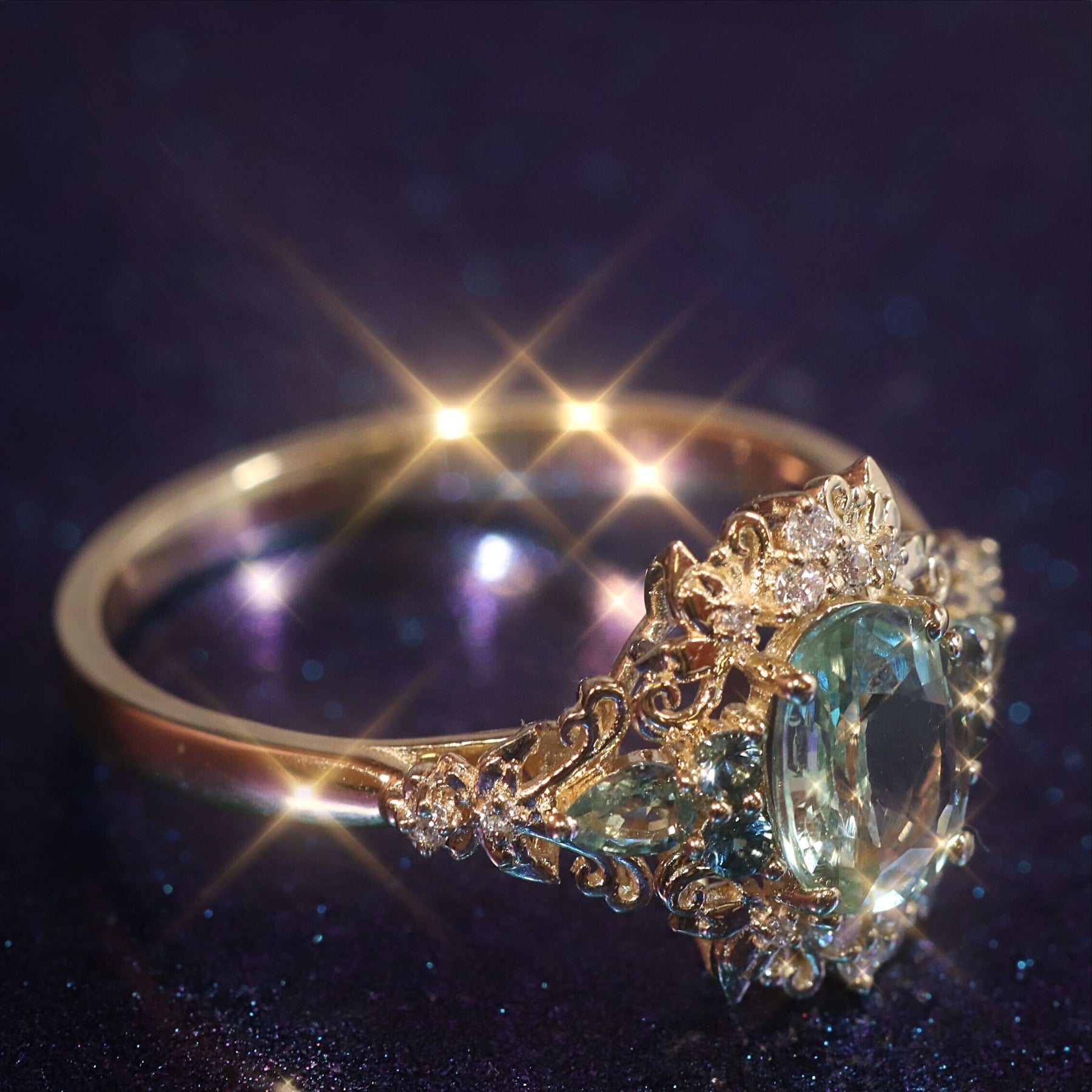 This gorgeous ring features intricate butterfly details studded in small diamonds with teal and green sapphire stones.
