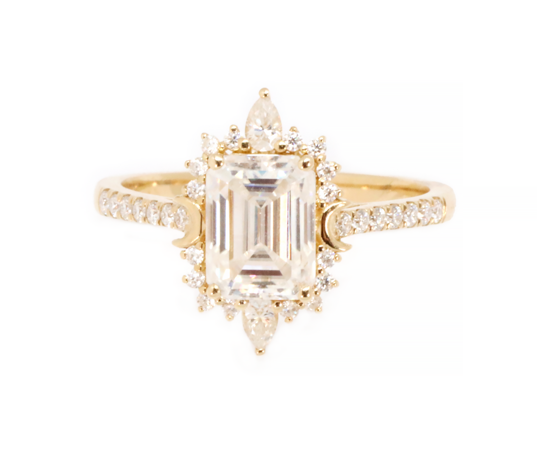 This Marlene 14KT Ring is an elegant statement piece. Its beautiful Moissanite stones are perfectly offset by the smaller stones, creating a graceful and mesmerizing look. Make this timeless piece part of your collection.