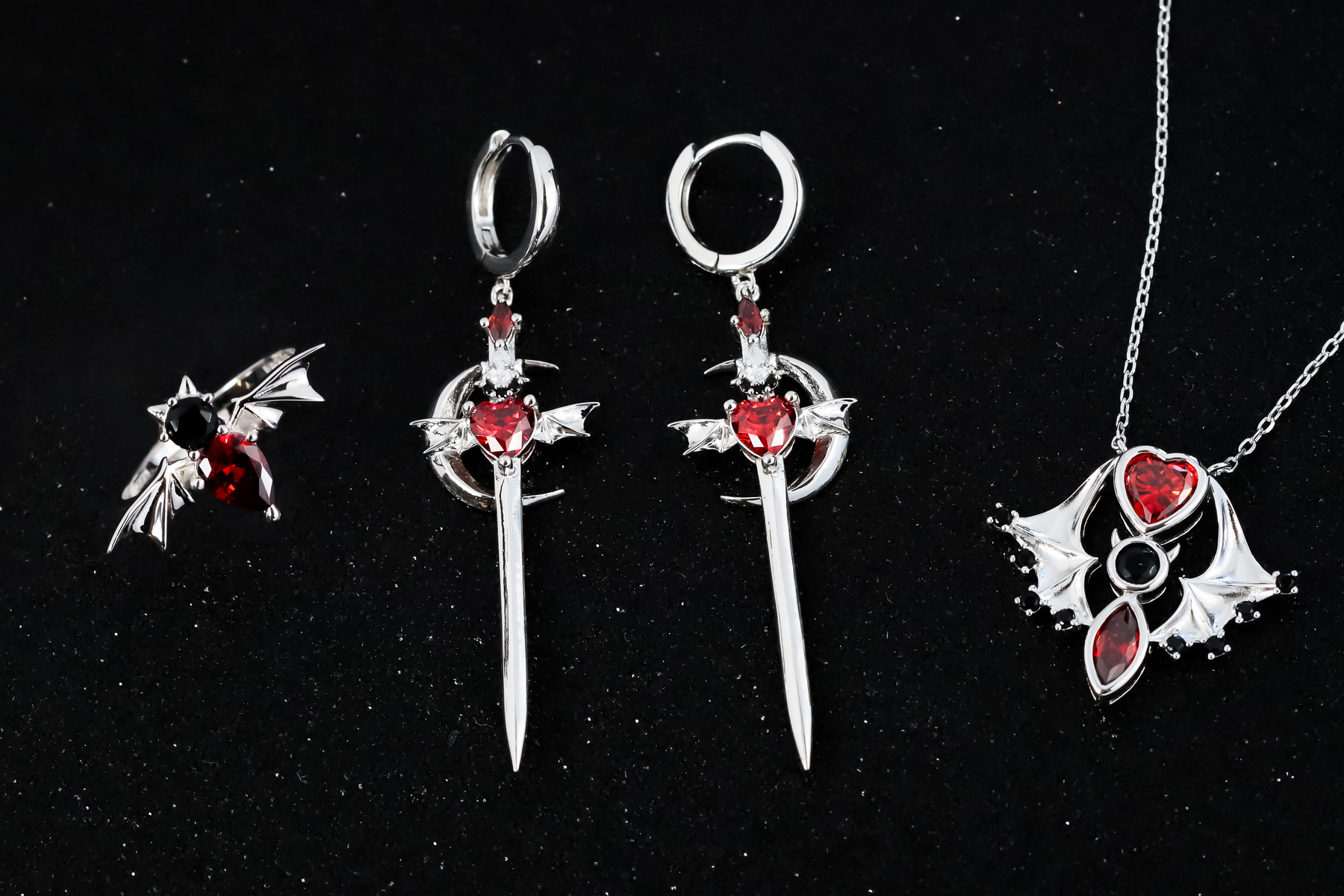 From delicate bat-wing details to glimmering stones that shimmer like red starlight, every design invites you to embrace your inner night spirit. Crafted with care and made to last, these pieces are perfect for anyone who finds magic in the shadows ✨🖤